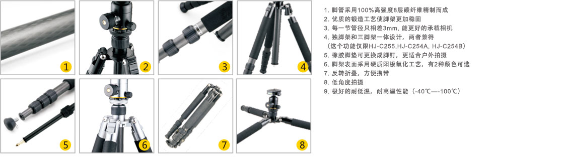 这个合捷系列碳纤专业三脚架采用高强度铝合金锻造而成,具有强度高,稳定性好,机动能力强等特点。